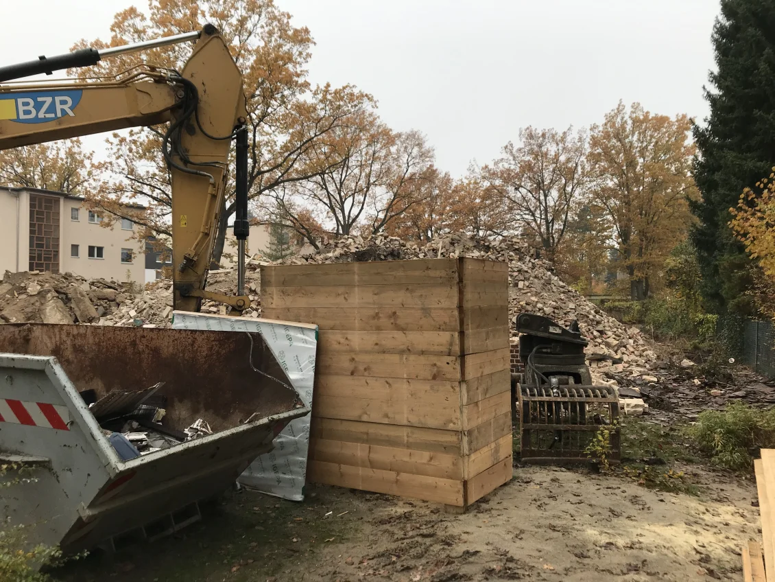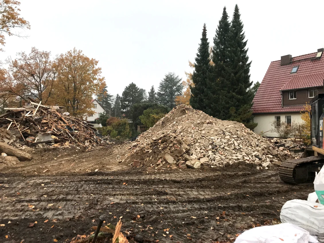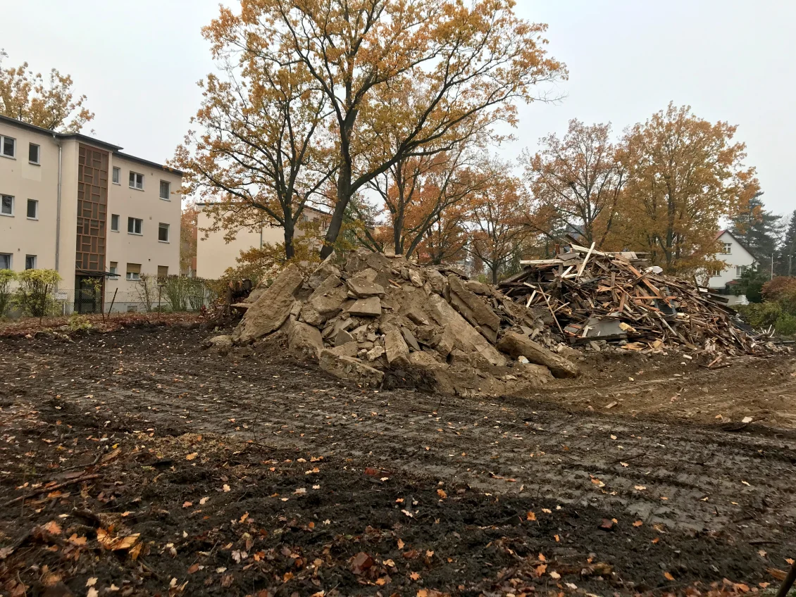 Das alte Gebäude ist vollständig abgerissen. Die unterschiedlichen Materialien werden sortiert, abgefahren und vor der Verwertung gesondert gelagert.
