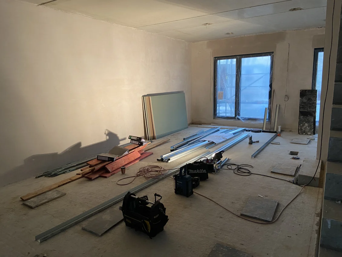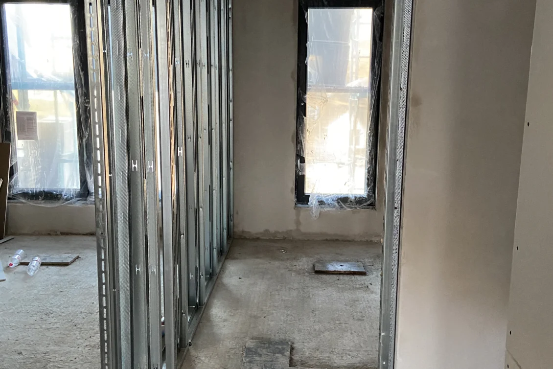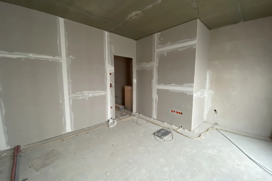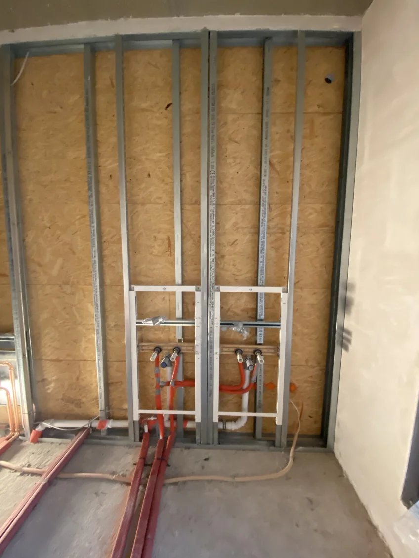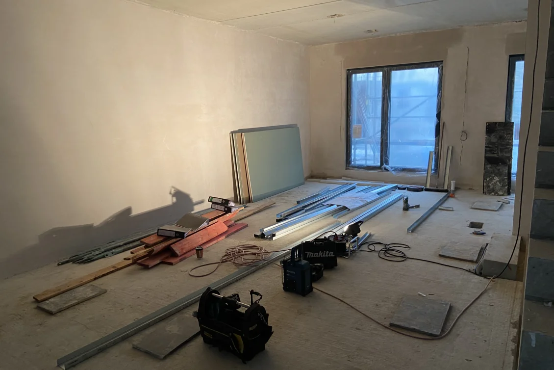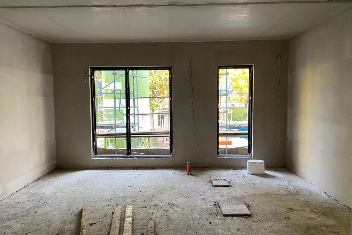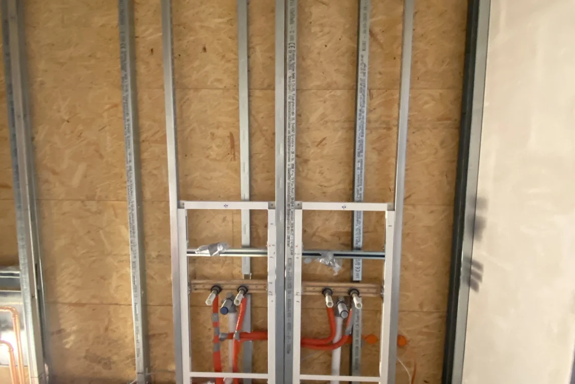 Die Elektro- und Sanitär-Installateure haben den Anfang gemacht und die Rohinstallation in Townhouse 2 abgeschlossen. Hier wurden alle Anschlüsse für Abwasser und Trinkwasser vorbereitet, Leitungen gelegt und Steckdosen final platziert. Nebenan in Townhouse 3 konnte zeitgleich der Trockenbau fertiggestellt werden.