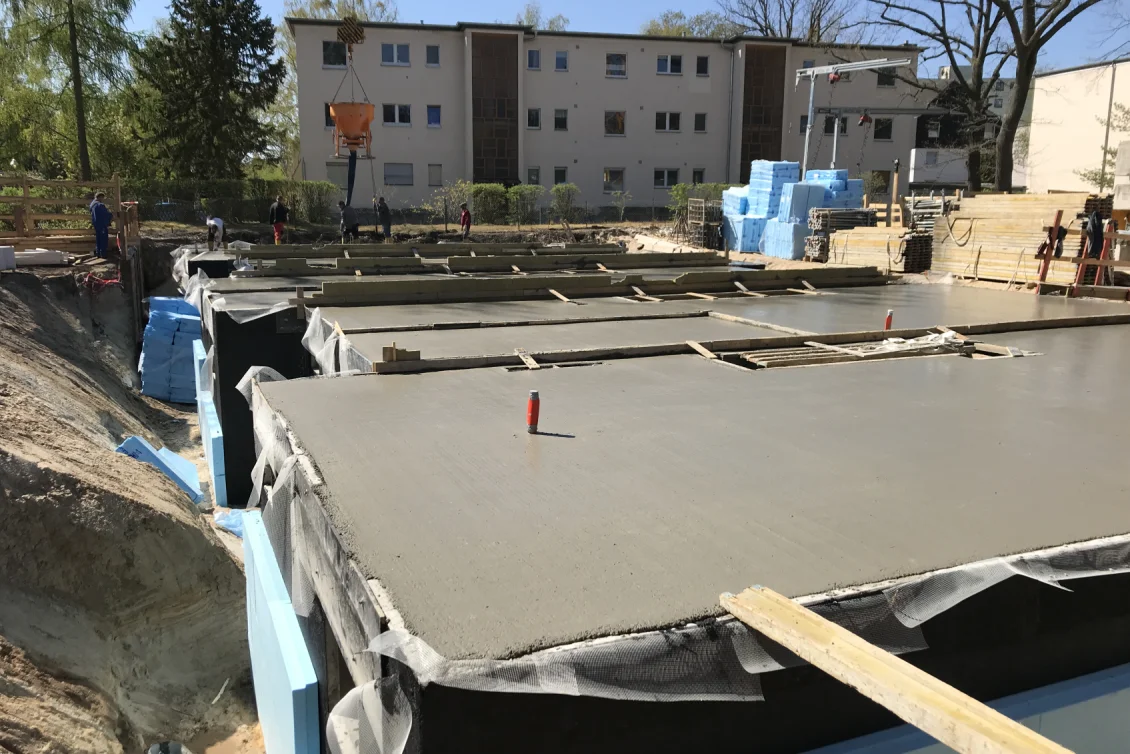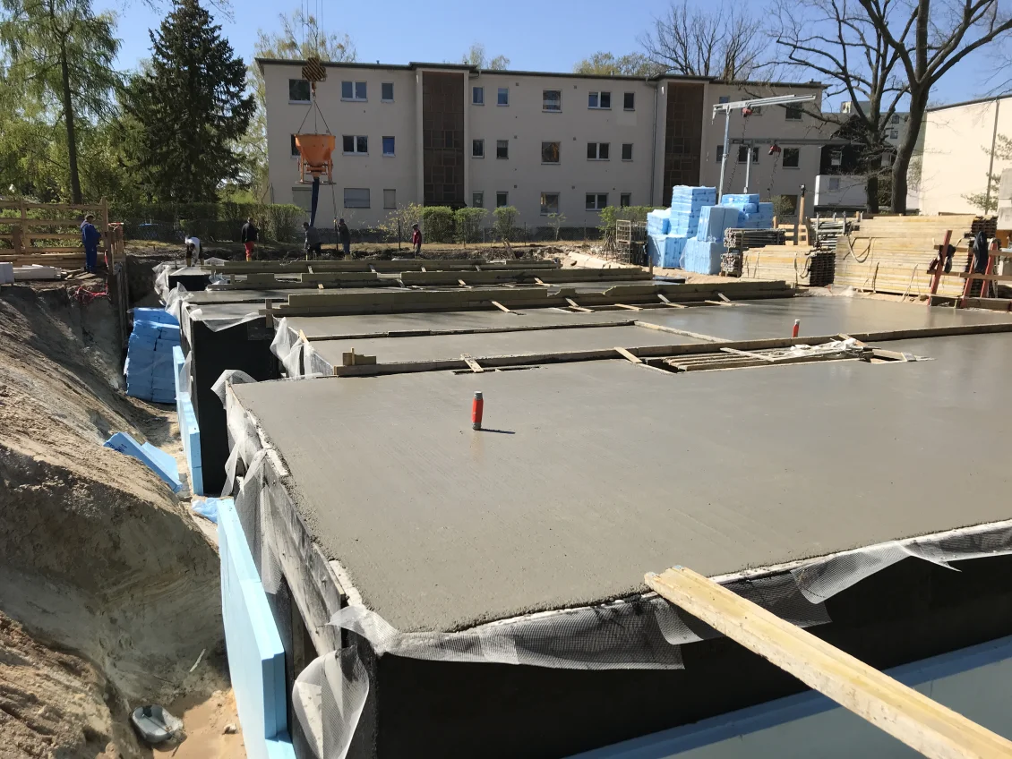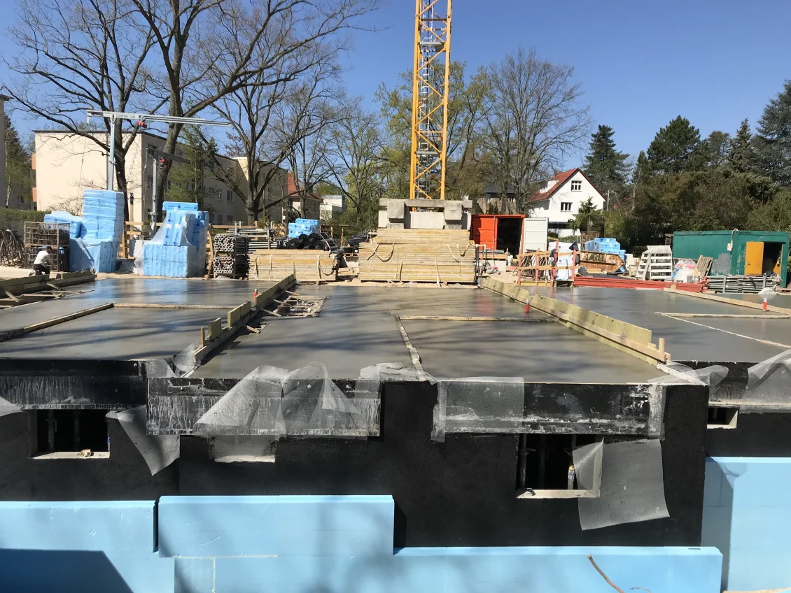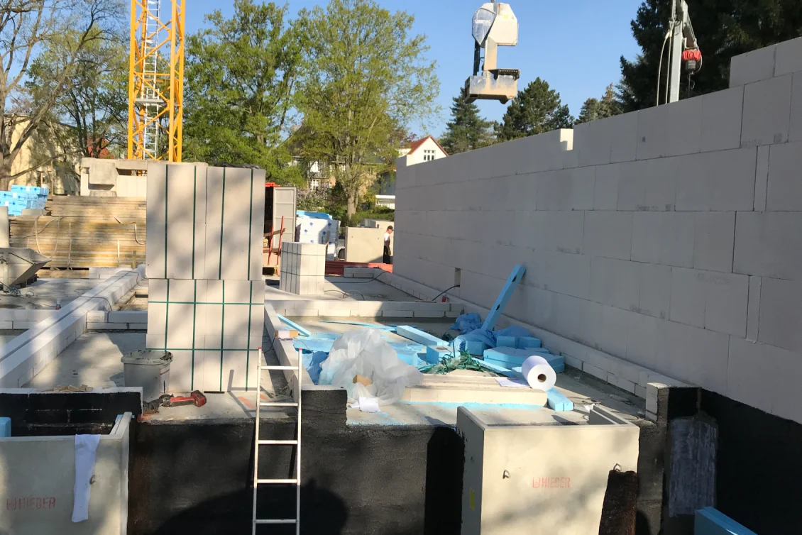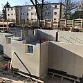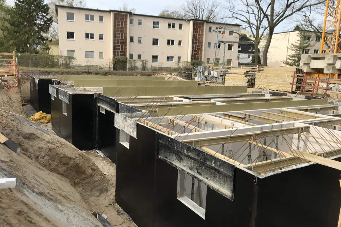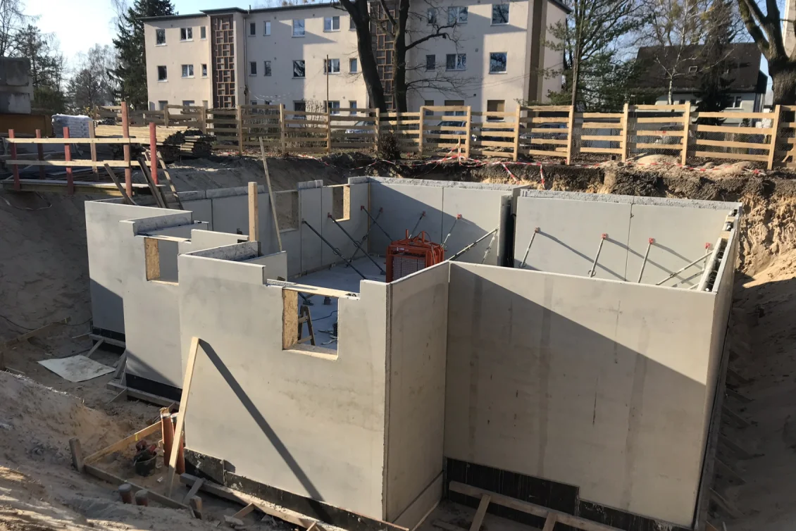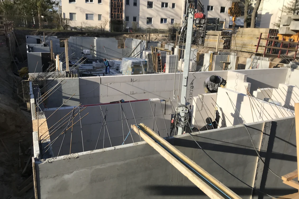 Die Sohlplatten beider Häuserkomplexe wurden fertiggestellt, sodass anschließend die Doppelwandelemente für das Untergeschoss geliefert und montiert wurden. Nach dem Aufstellen der geschosshohen Elementwände wird der Raum zwischen den beiden Fertigplatten mit Beton verfüllt.