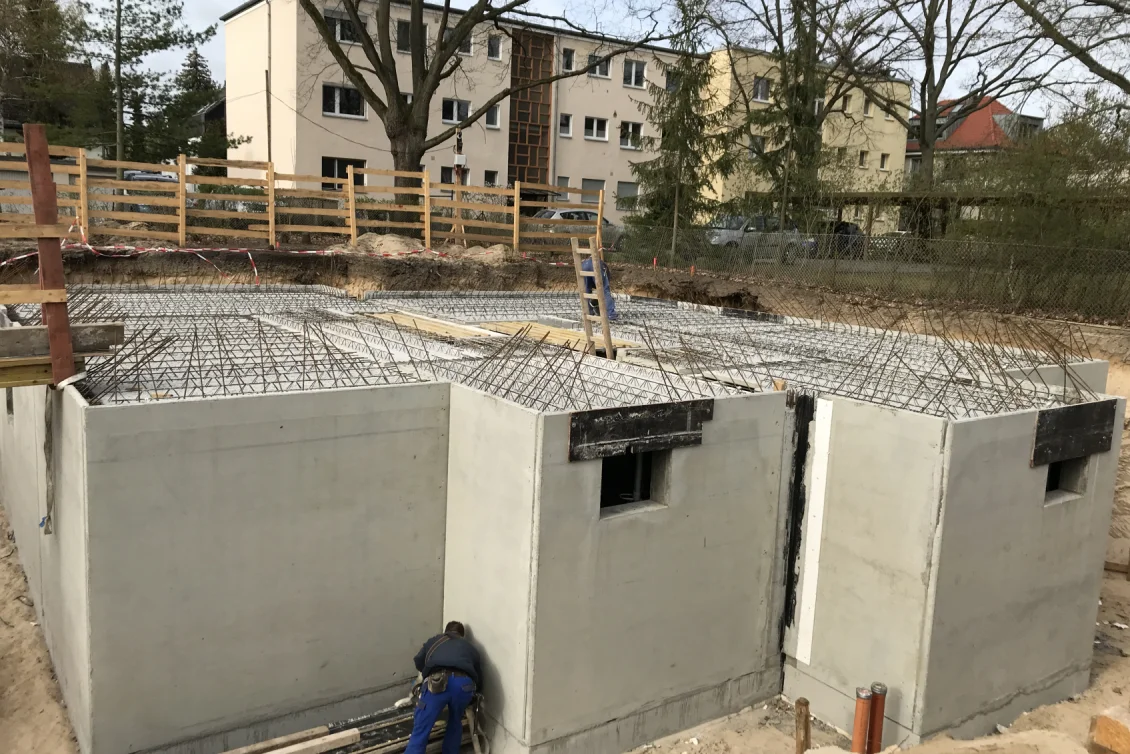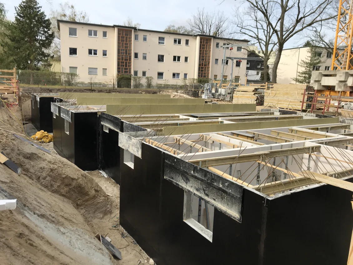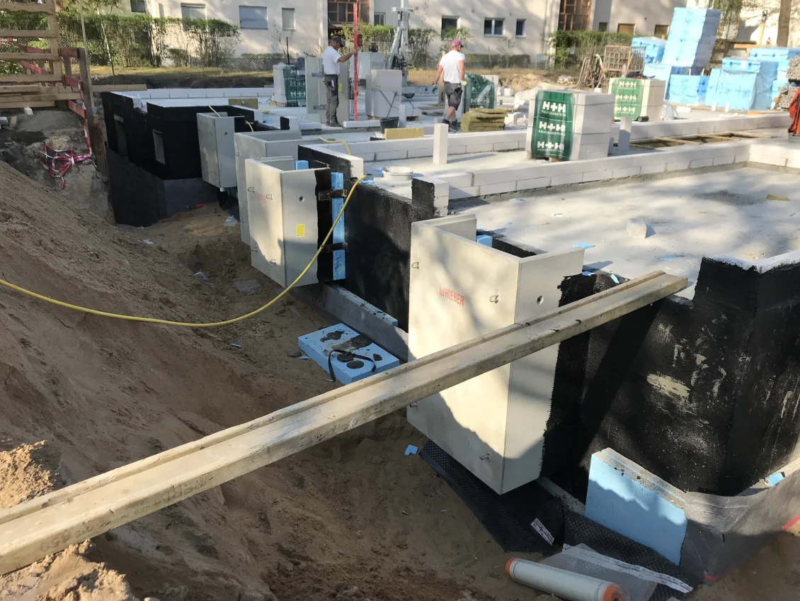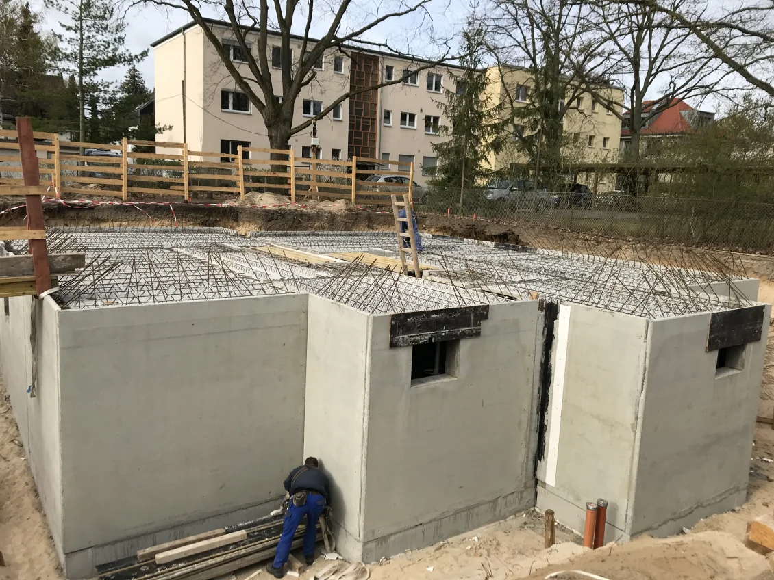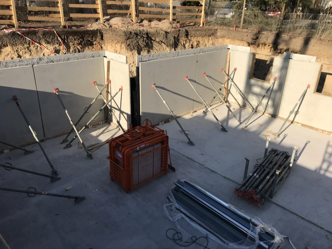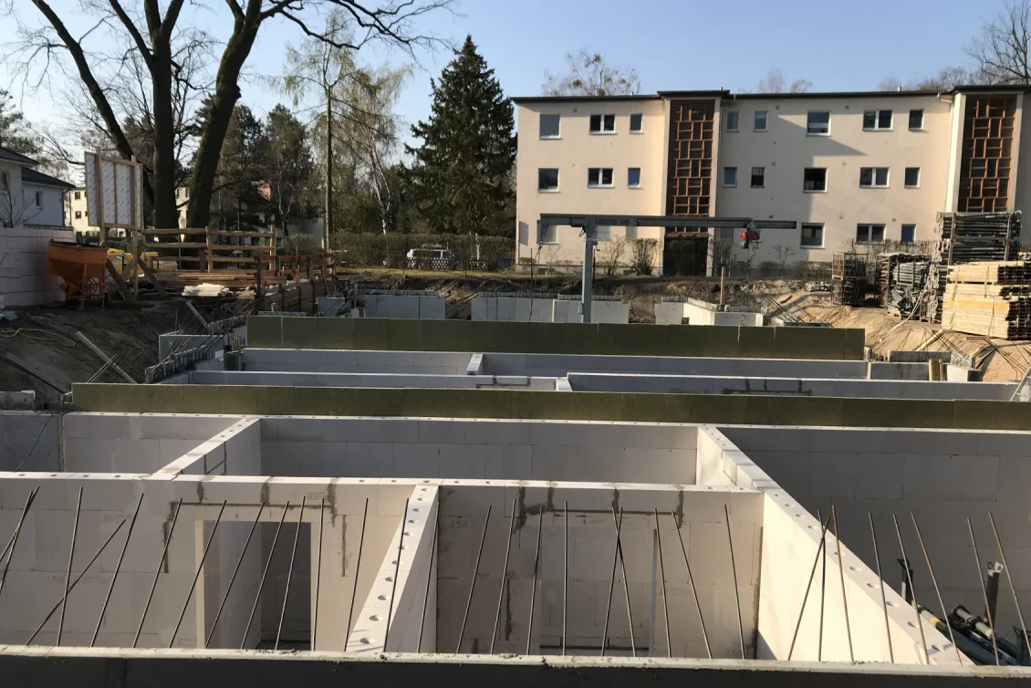 Die Sohlplatten beider Häuserkomplexe wurden fertiggestellt, sodass anschließend die Doppelwandelemente für das Untergeschoss geliefert und montiert wurden. Nach dem Aufstellen der geschosshohen Elementwände wird der Raum zwischen den beiden Fertigplatten mit Beton verfüllt.