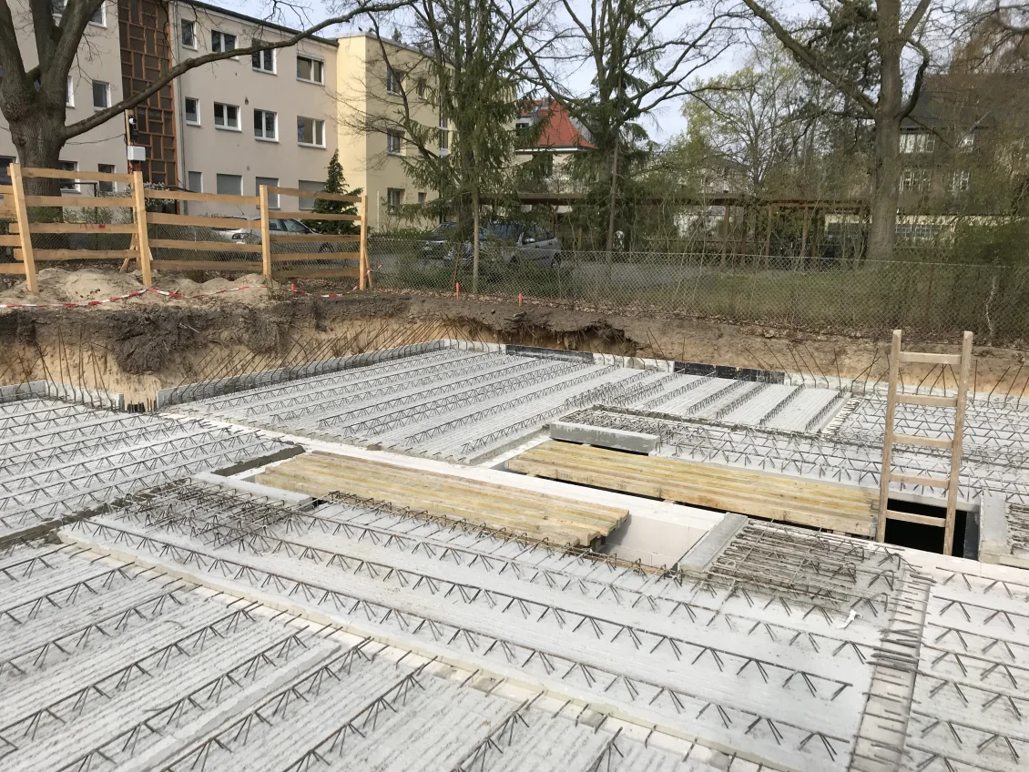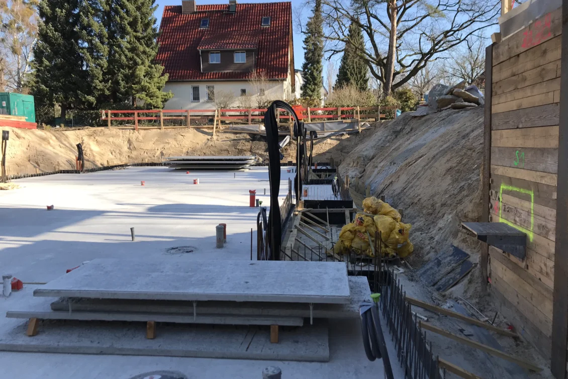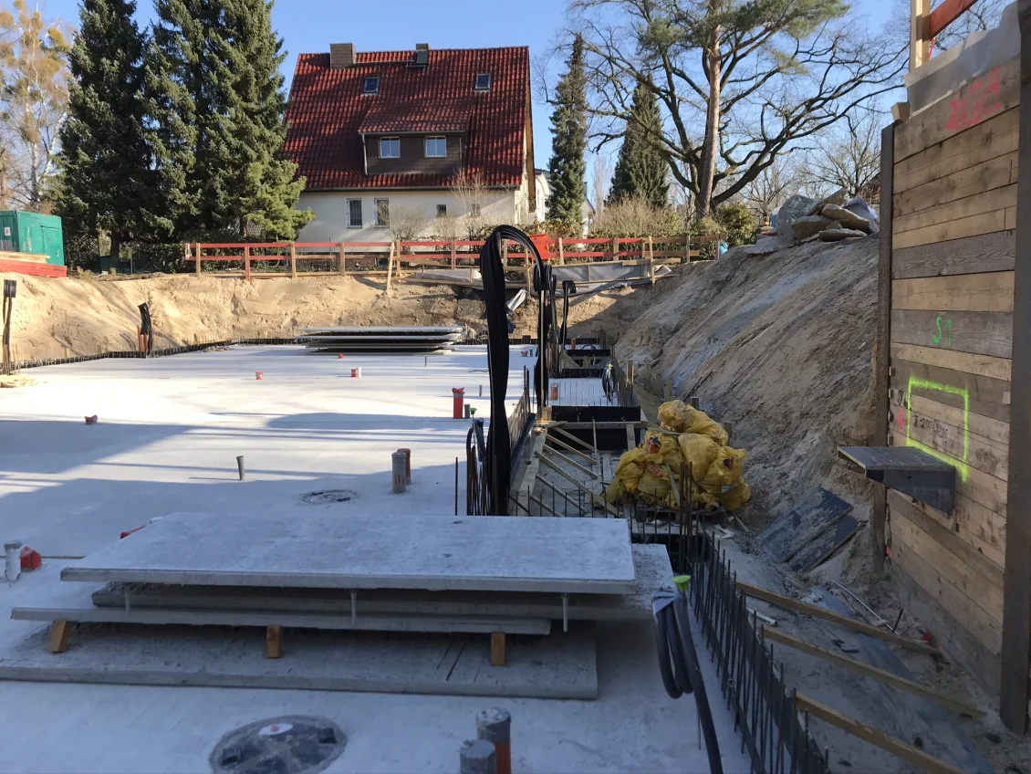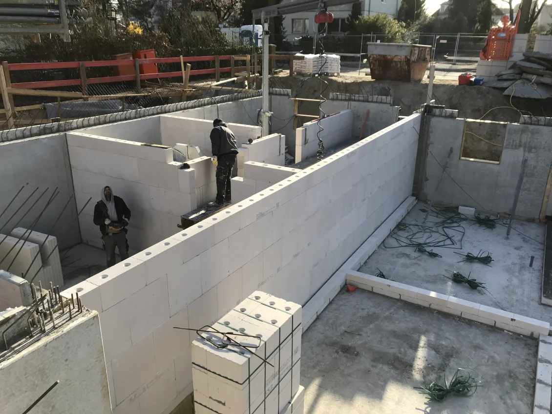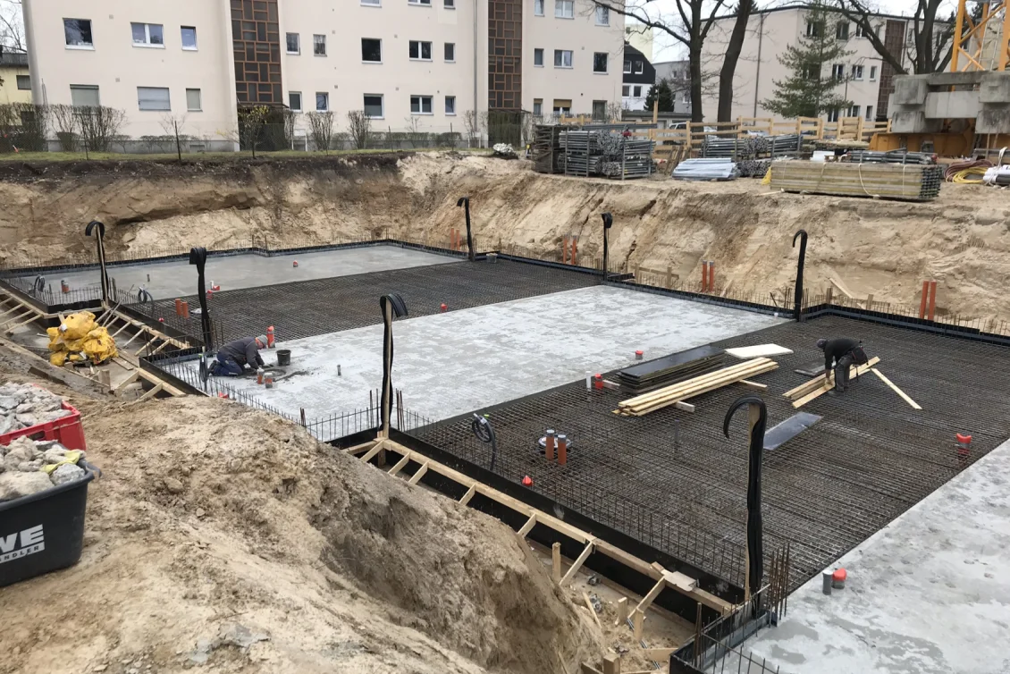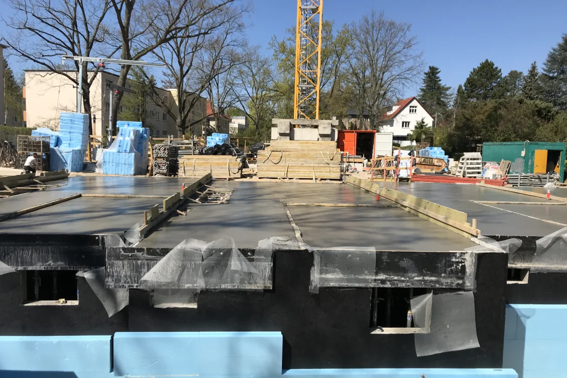 Die Sohlplatten beider Häuserkomplexe wurden fertiggestellt, sodass anschließend die Doppelwandelemente für das Untergeschoss geliefert und montiert wurden. Nach dem Aufstellen der geschosshohen Elementwände wird der Raum zwischen den beiden Fertigplatten mit Beton verfüllt.