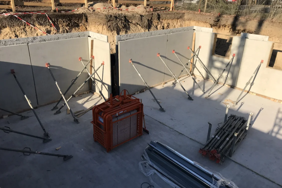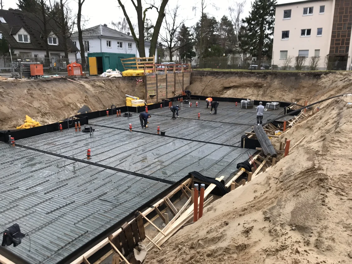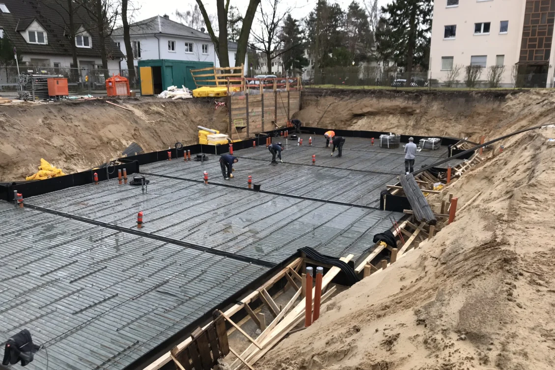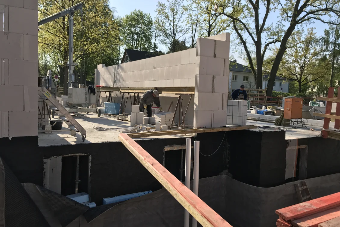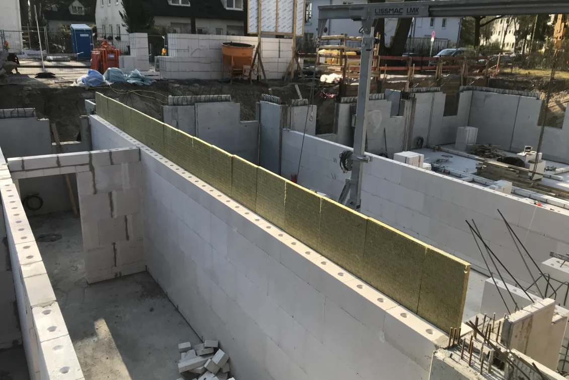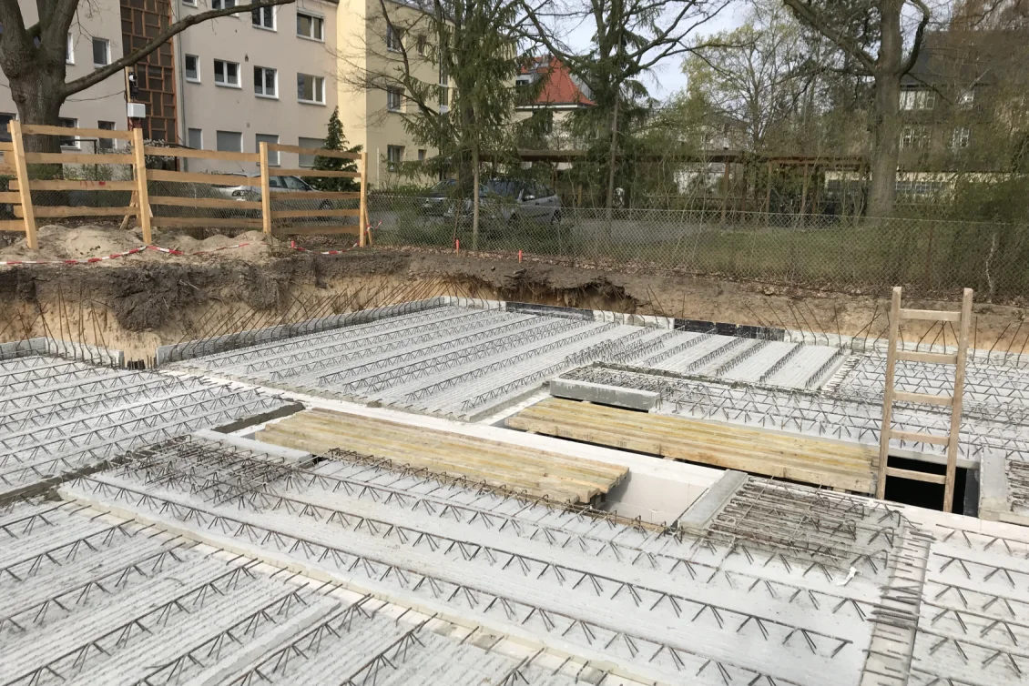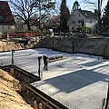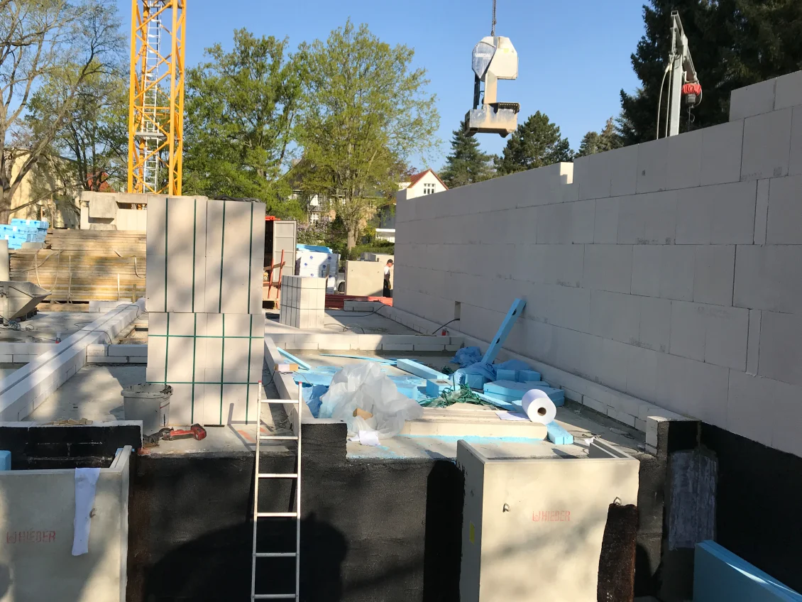 Die Sohlplatten beider Häuserkomplexe wurden fertiggestellt, sodass anschließend die Doppelwandelemente für das Untergeschoss geliefert und montiert wurden. Nach dem Aufstellen der geschosshohen Elementwände wird der Raum zwischen den beiden Fertigplatten mit Beton verfüllt.