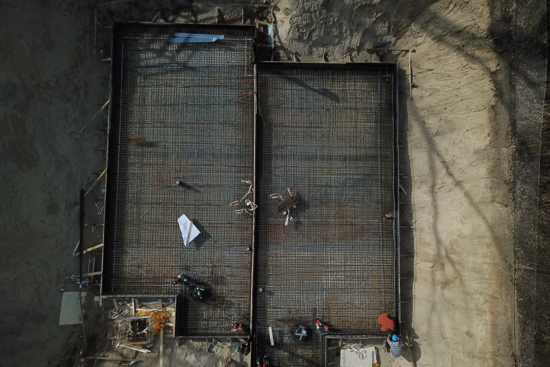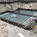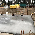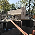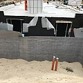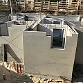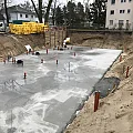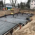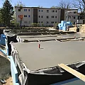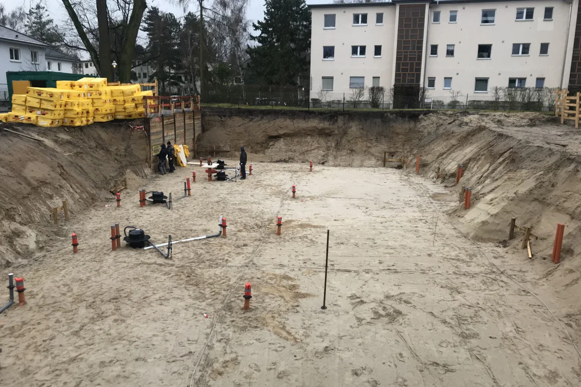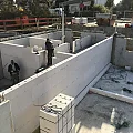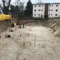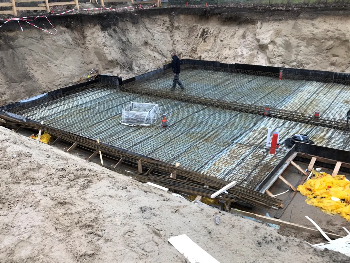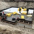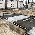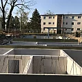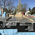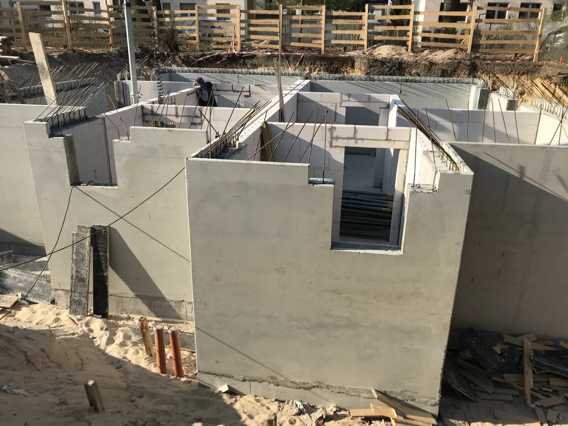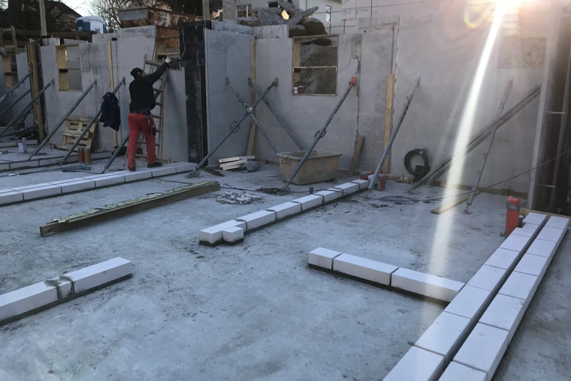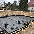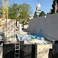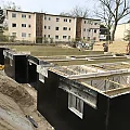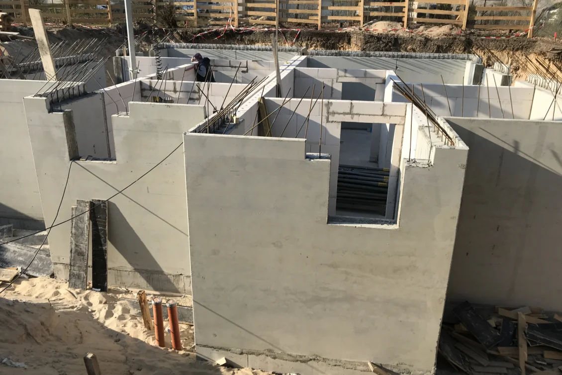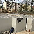Die Sohlplatten beider Häuserkomplexe wurden fertiggestellt, sodass anschließend die Doppelwandelemente für das Untergeschoss geliefert und montiert wurden. Nach dem Aufstellen der geschosshohen Elementwände wird der Raum zwischen den beiden Fertigplatten mit Beton verfüllt.