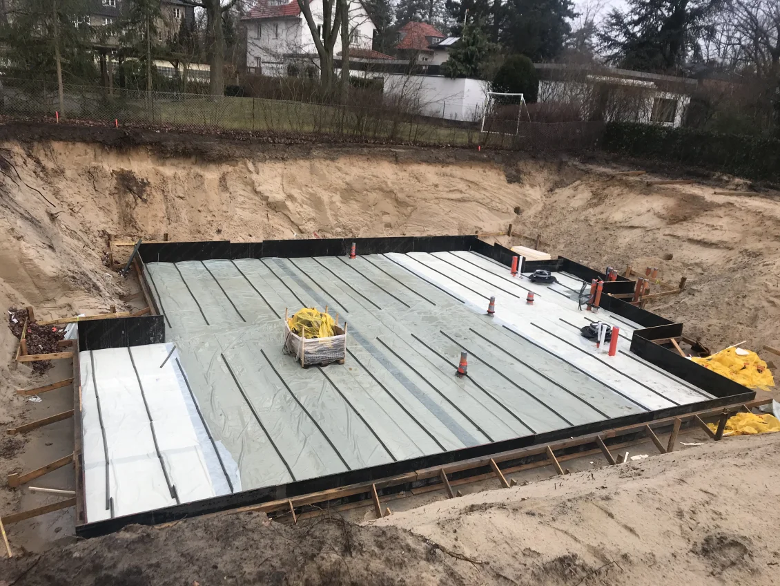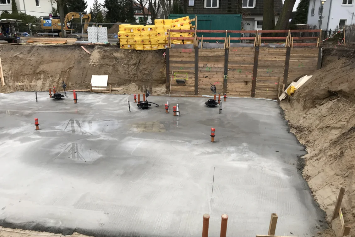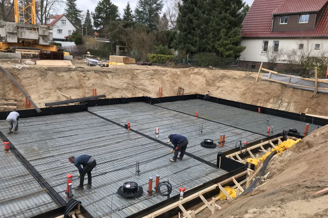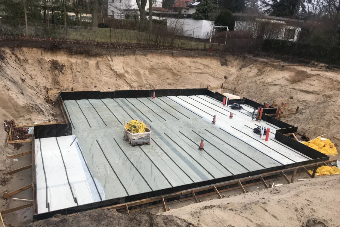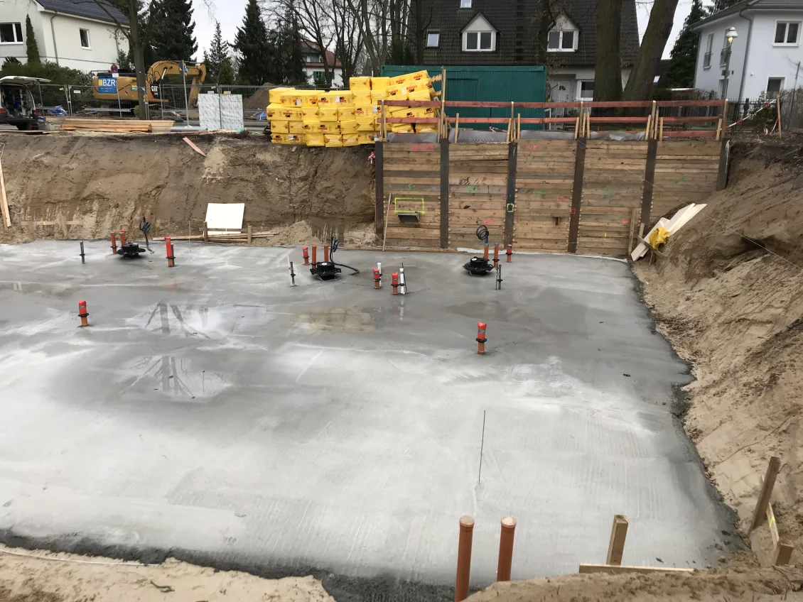 Die Filigrandecken über dem Untergeschoss werden mittels einer sogenannten Betonbombe betoniert. Gleichzeitig werden die Außenwände des Untergeschosses abgedichtet und mit einer Perimeterdämmung versehen. Zum Schutz vor Beschädigung wird außerhalb eine Noppenbahn angebracht, deren Drainagesystem zuverlässig Wasser abführt.