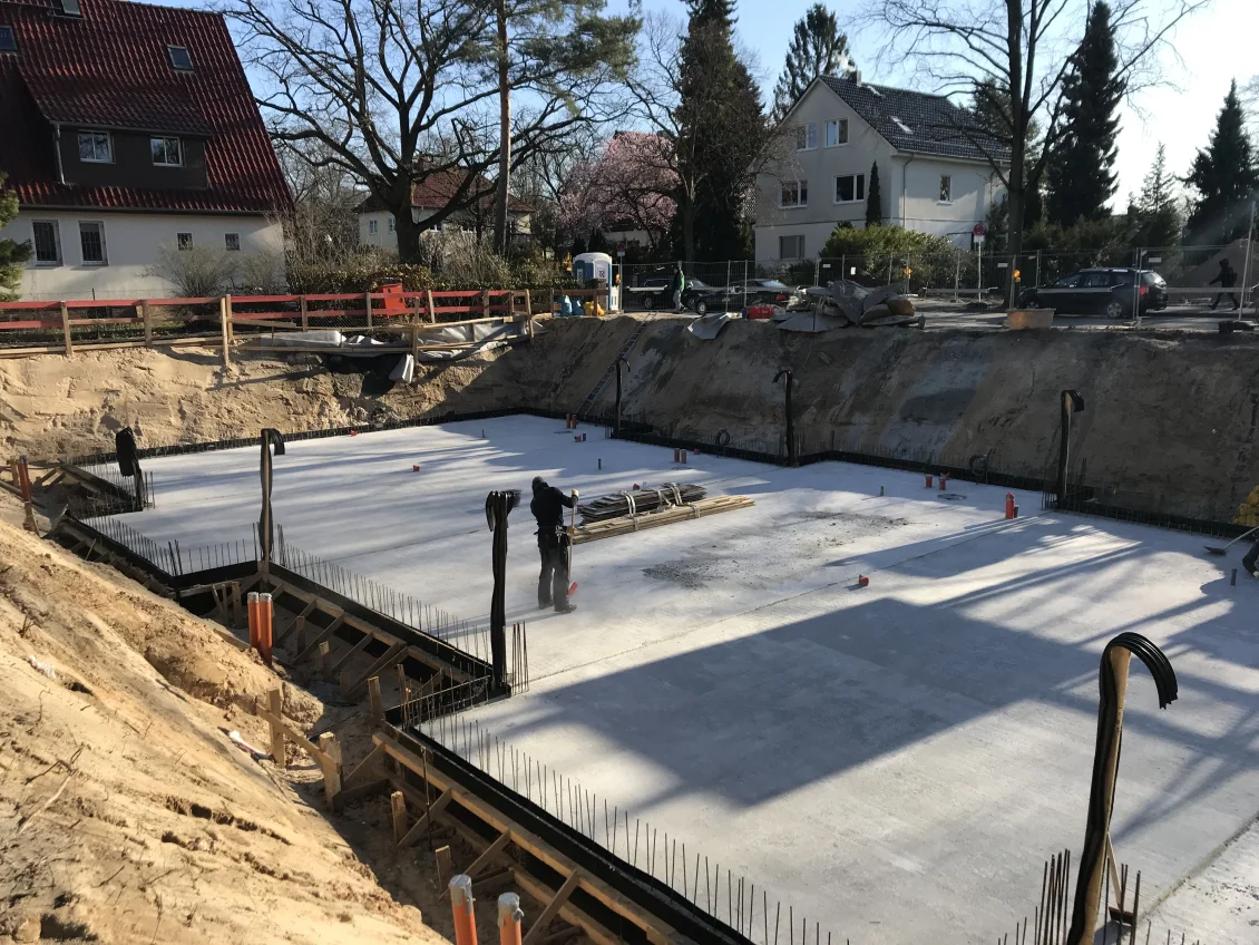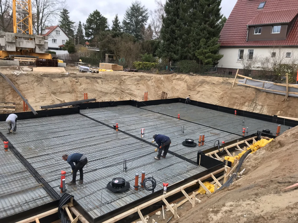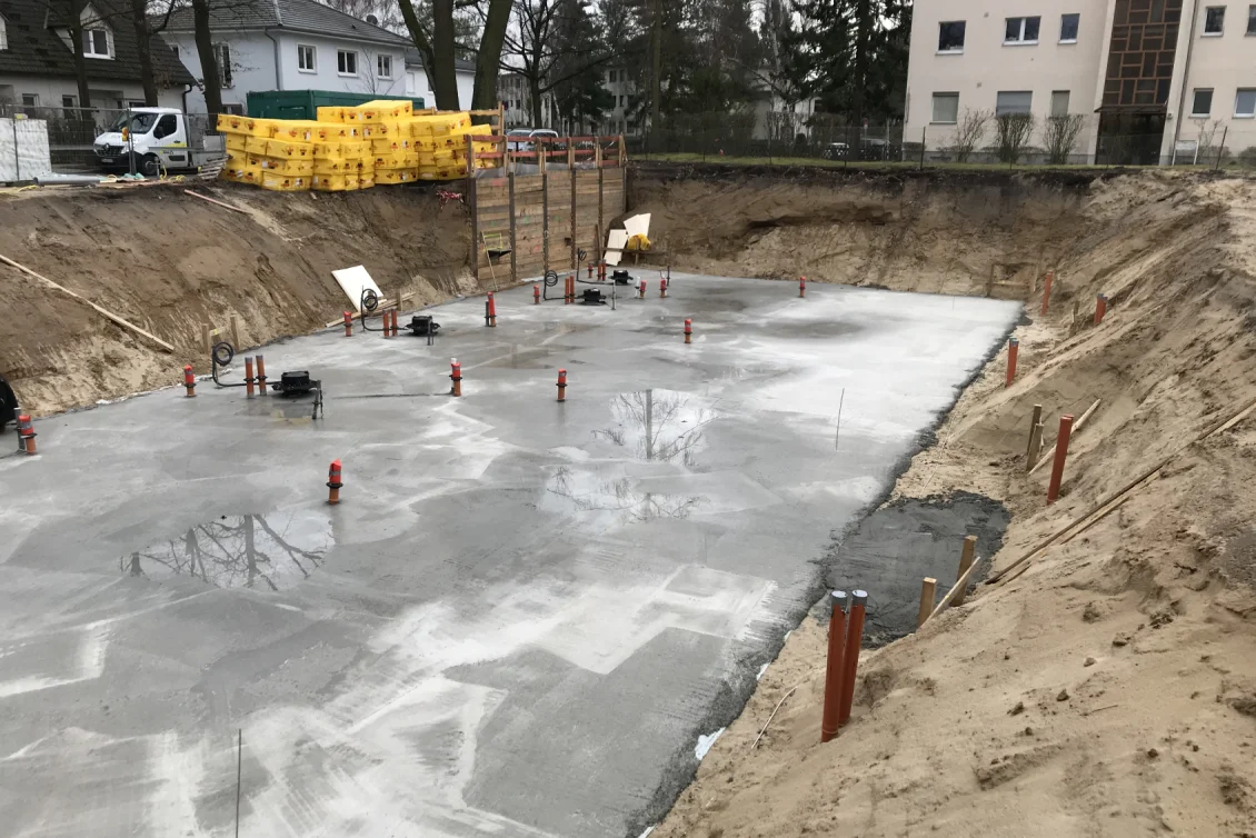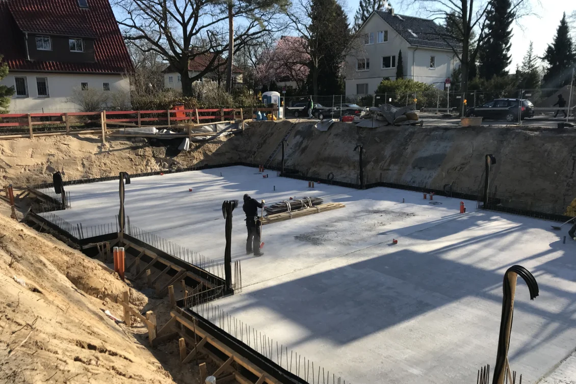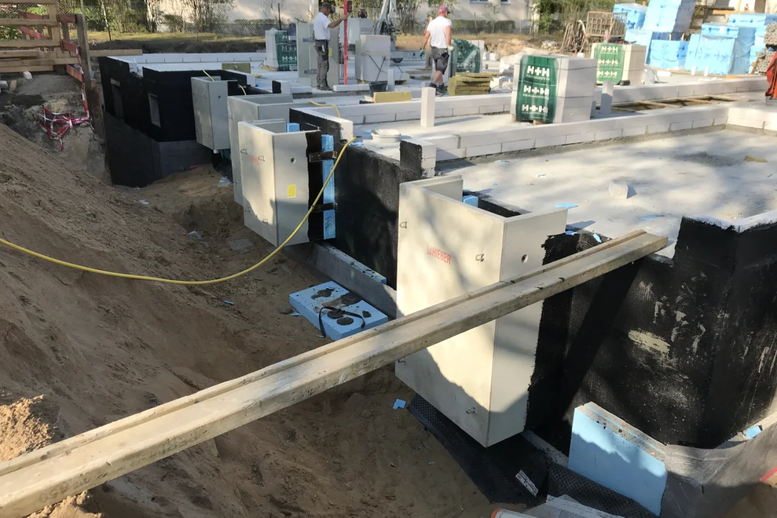Die Filigrandecken über dem Untergeschoss werden mittels einer sogenannten Betonbombe betoniert. Gleichzeitig werden die Außenwände des Untergeschosses abgedichtet und mit einer Perimeterdämmung versehen. Zum Schutz vor Beschädigung wird außerhalb eine Noppenbahn angebracht, deren Drainagesystem zuverlässig Wasser abführt.