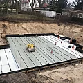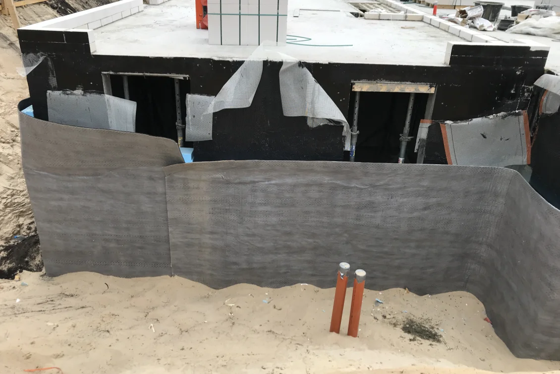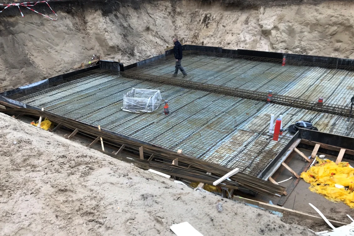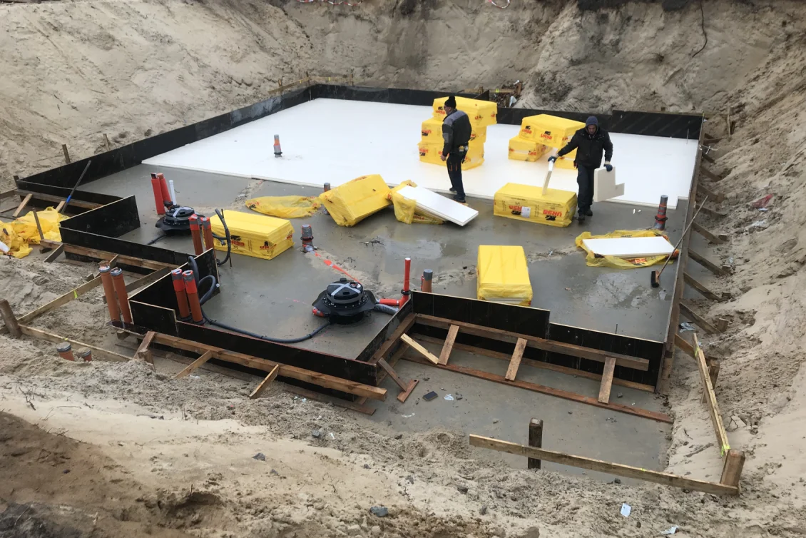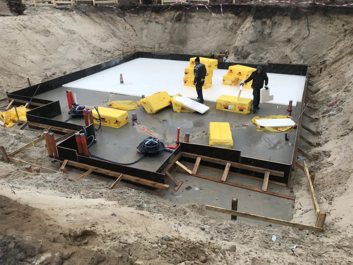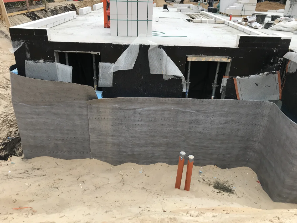 Die Filigrandecken über dem Untergeschoss werden mittels einer sogenannten Betonbombe betoniert. Gleichzeitig werden die Außenwände des Untergeschosses abgedichtet und mit einer Perimeterdämmung versehen. Zum Schutz vor Beschädigung wird außerhalb eine Noppenbahn angebracht, deren Drainagesystem zuverlässig Wasser abführt.