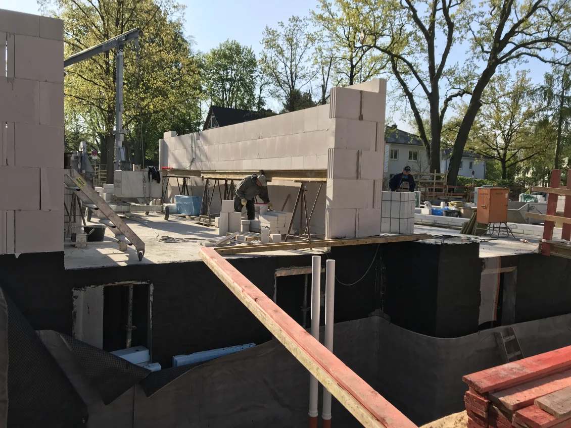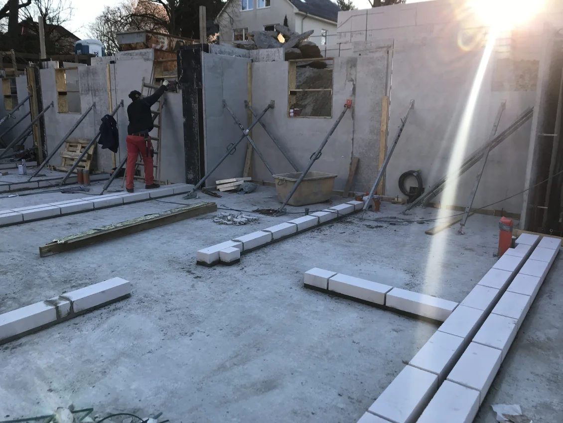 Alle Außenwände aus Doppelwandelementen sind fertig betoniert. Anschließend wurde mit dem Anlegen der Kimmschicht, die zum Ausgleich von Unebenheiten in Längst- und Querrichtung der Wand dient, begonnen. Die ersten Innenwände wurden bereits aufgemauert, sobald der Mörtel ausgehärtet ist.