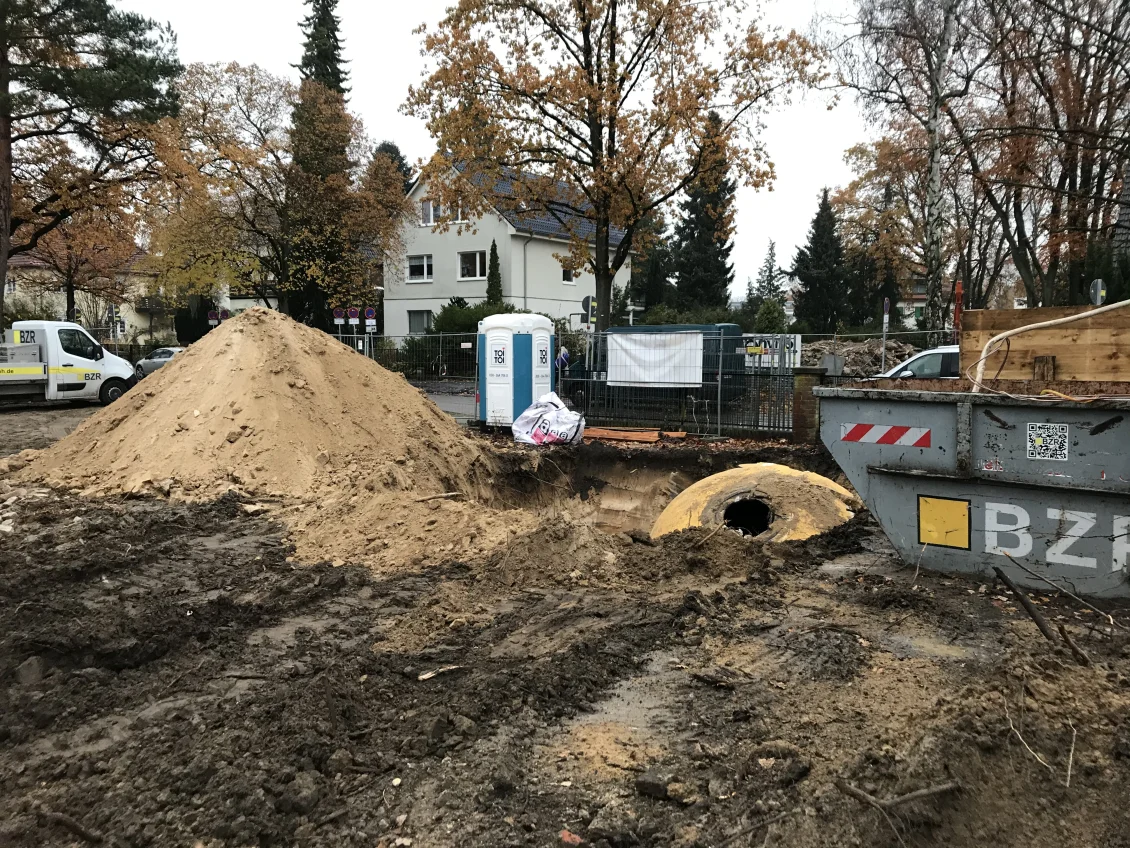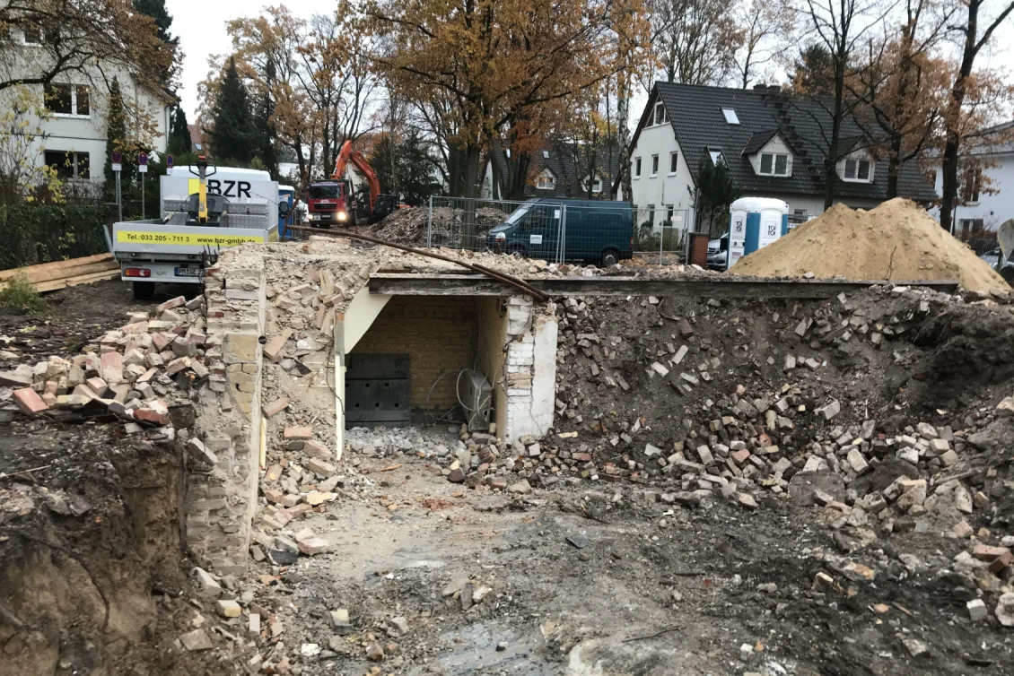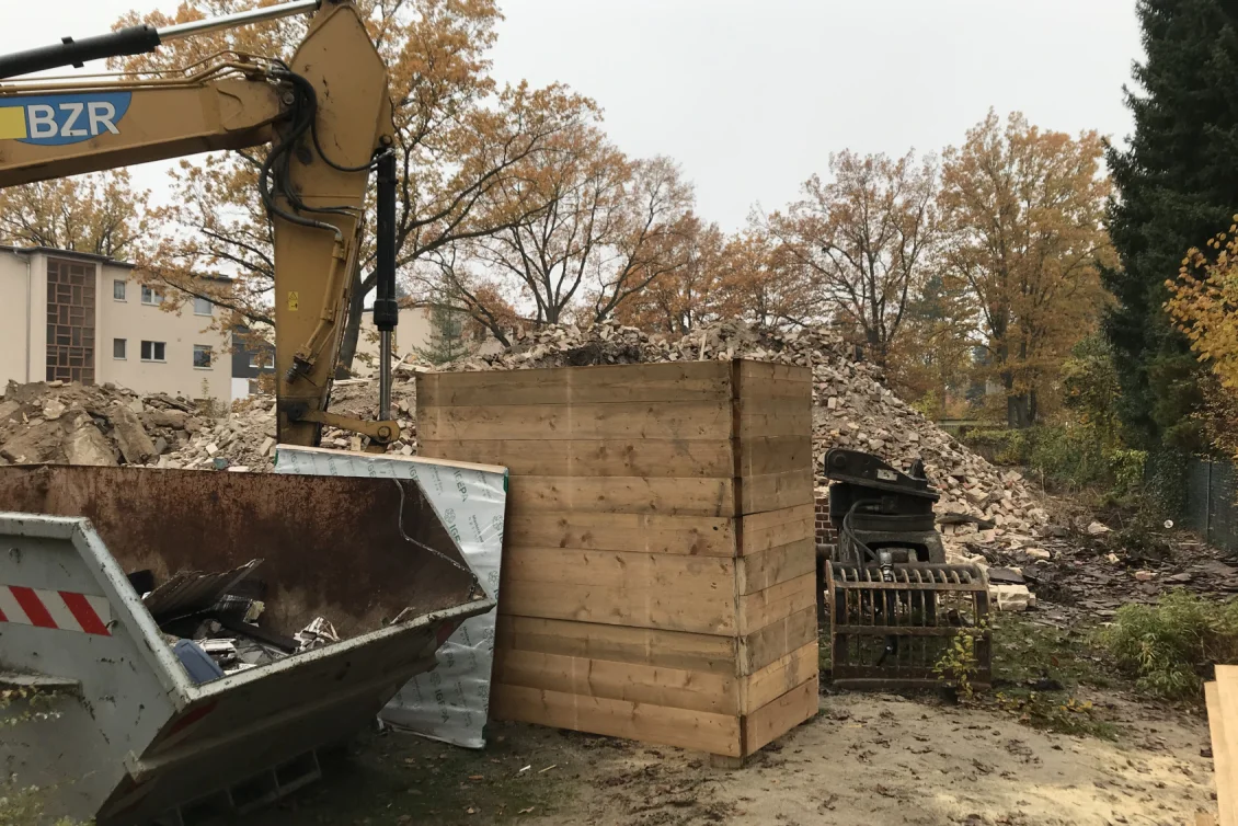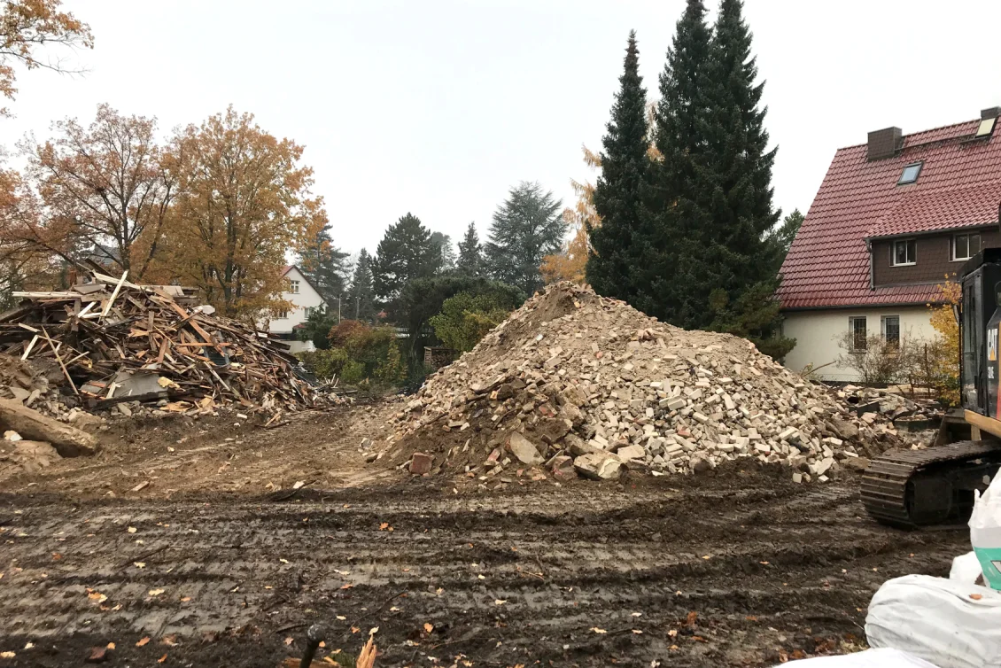 Die Abbrucharbeiten sind abgeschlossen und das überschüssige Material wird nach Wertstoffen getrennt abtransportiert. Der alte Öltank, auf den wir unter der Erde gestoßen sind, wurde TÜV-gerecht entleert, in seine Bestandteile zerlegt und entsorgt. Die Towns & Twins werden über Erdwärme beheizt, da haben fossile Brennstoffe nichts zu suchen.