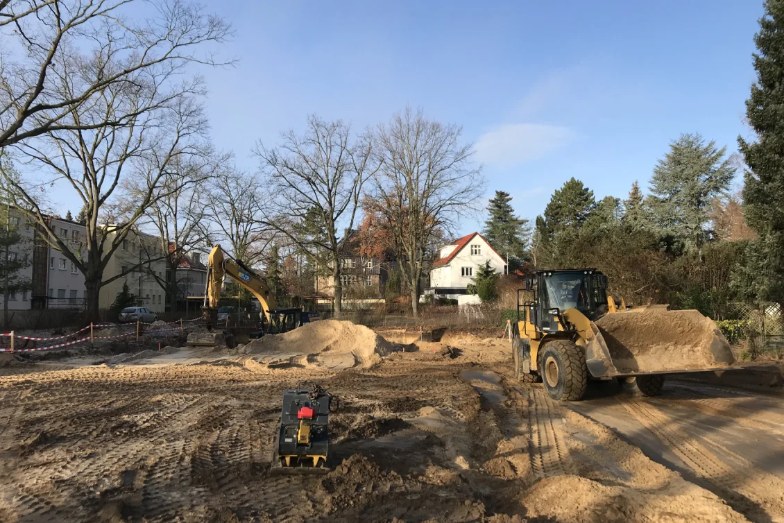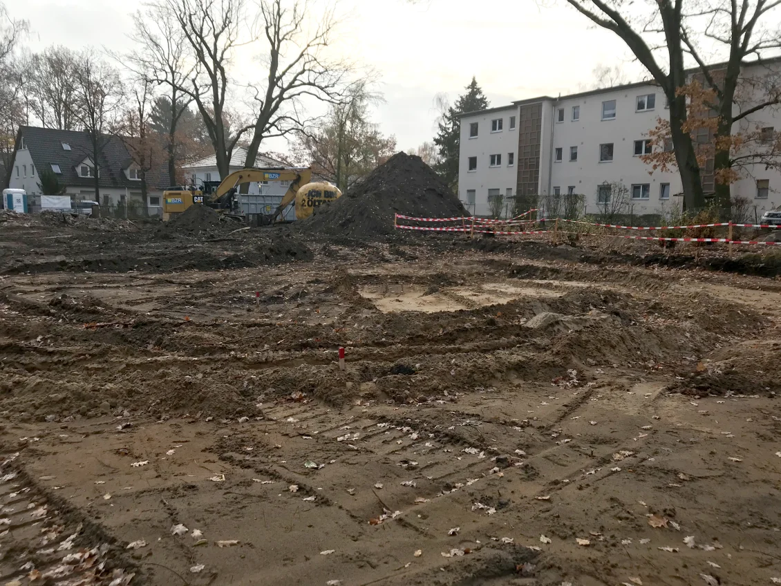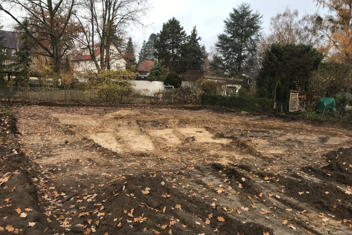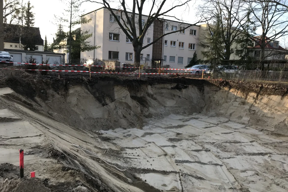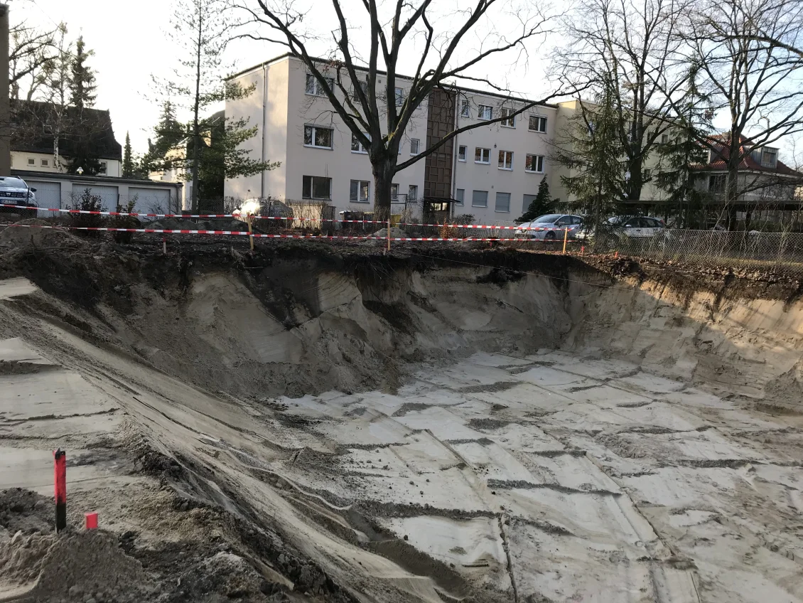 Nach Fertigstellung der Abbrucharbeiten kann nun mit dem Ausheben der Baugrube angefangen werden. Es wurde mit der Grube für die im hinteren Teil gelegenen Twinhouses begonnen. Im vorderen straßenseitigen Bereich wird ein 10m langer Verbau errichtet. Dem Baum- und Wurzelschutzes zuliebe ist an dieser Stelle keine großflächige Böschung möglich.