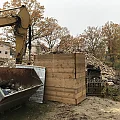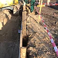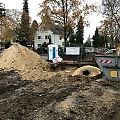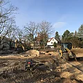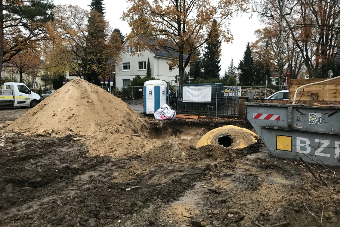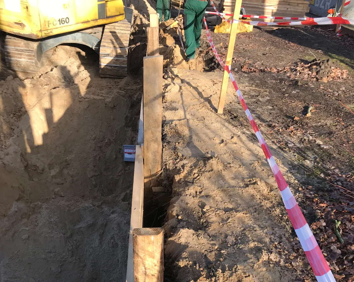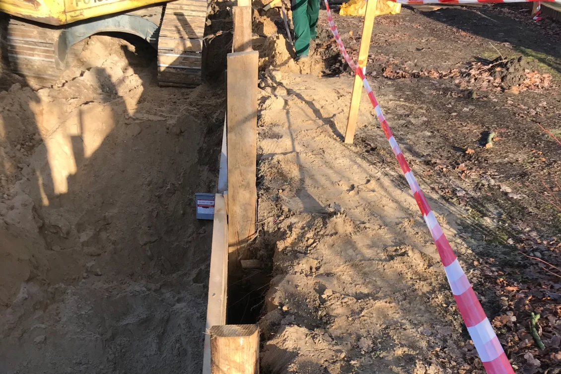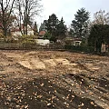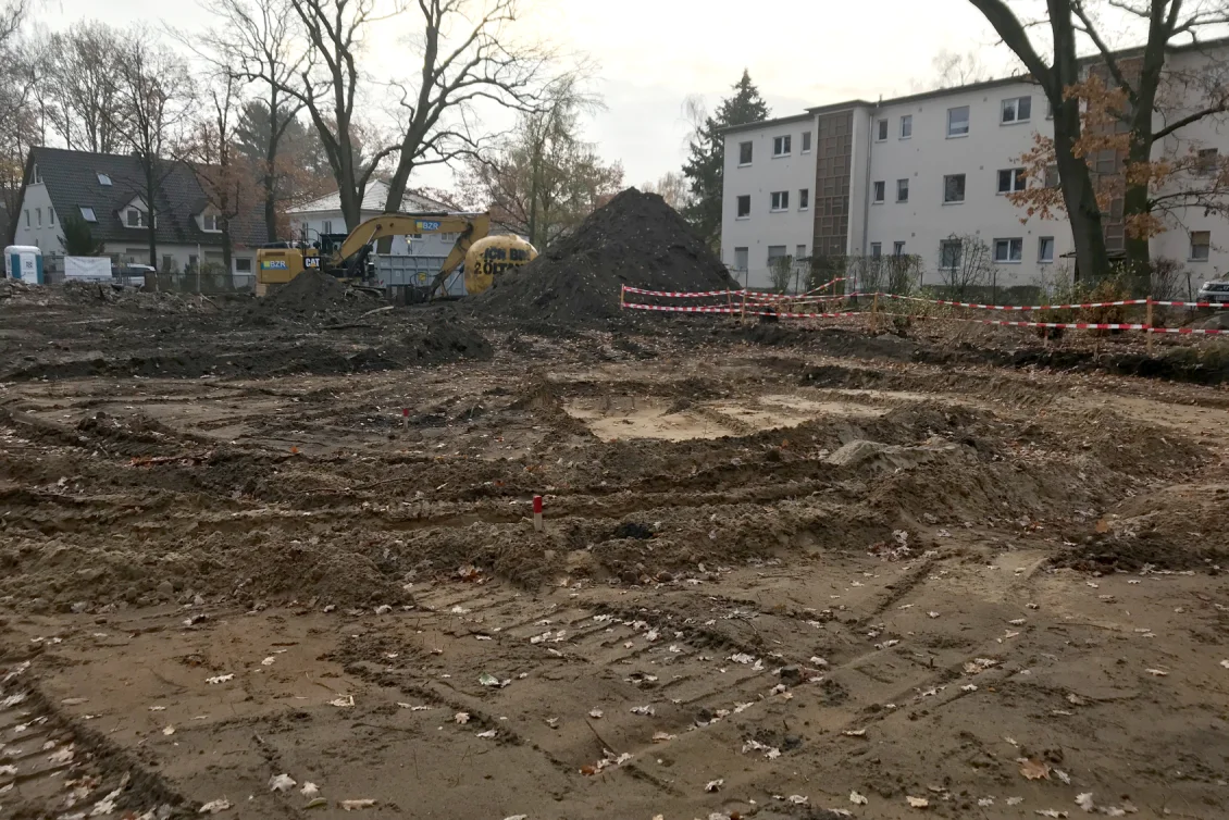 Nach Fertigstellung der Abbrucharbeiten kann nun mit dem Ausheben der Baugrube angefangen werden. Es wurde mit der Grube für die im hinteren Teil gelegenen Twinhouses begonnen. Im vorderen straßenseitigen Bereich wird ein 10m langer Verbau errichtet. Dem Baum- und Wurzelschutzes zuliebe ist an dieser Stelle keine großflächige Böschung möglich.